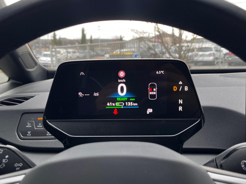 activation automatique du signal de détresse en cas de freinage d'urgence / allumage automatique des feux, capteurs de pluie avec essuie-glace automatique / boîte de vitesse automatique à variation continue / climatisation stationnaire: permet de réfrigérer, de ventiler ou de chauffer l'habitacle du véhicule à l'arrêt. elle permet également de dégivrer le pare-brise, de le désembuer et de le débarrasser d'une fine couche de neige en hiver. la climatisation stationnaire est alimentée par la prise de courant ou par la batterie haute tension du véhicule / eclairage à led de la plaque d'immatriculation ar / frein de stationnement électromécanique avec fonction d'immobilisation en pente "auto hold" la fonction auto hold garantit une immobilisation du véhicule sans déplacement intempestif, la pédale de frein ne devant pour cela pas être maintenue actionnée / id. display de 5,3'': l'id. display est un combiné d'instruments numérique doté d'un afficheur couleur tft à haute résolution. en plus du tachymètre numérique, il est possible d'afficher des informations supplémentaires provenant des systèmes d'aide à la conduite, par la sélection de divers profils d'information / intervention de freinage automatique lors des manoevres: l'intervention de freinage automatique d'un système de stationnement est utilisée pour réduire le risque de collision si un obstacle est détecté pendant le processus de stationnement / jantes 18'' "east derry" bicolore argent pneumatiques 215/55 r18 / park pilot - aide au stationnement av et ar / rétroviseur intérieur à réglage jour/nuit automatique / sign assist - système de détection de la signalisation routière le système de détection de la signalisation routière détecte les panneaux de signalisation standard à l'aide d'une caméra située dans le pied du rétroviseur intérieur et vous informe des limitations de vitesse, interdictions de dépasser et panneaux de danger identifiés / système d'aide à l'éco-conduite - eco assistance / système d'appel d'urgence - ecall appel d'urgence manuel ou automatique / système de freinage anti-multi collision ce dispositif freine automatiquement le véhicule après un premier choc afin de limiter le risque de multi collision / sélecteur de vitesse situéà droite derrière le volant avec frein de stationnement électronique il dispose d'une marche av (d/b), du neutre (n) et d'une marche ar (r). en position (d), la récupération d'énergie au freinage est en mode normal. en position (b), le système d'aide à l'éco-conduite est activé et la récupération d'énergie est plus élevée / 2 port usb-c à l'av (recharge et data) et 2 à l'ar (recharge) / 7 airbags airbags frontaux av conducteur et passager (airbag passager désactivable par clé), airbags latéraux à l'av, airbags interactif à l'av et avec airbags de tête av/ar, airbag central situé sur le côté droit du siège conducteur, permet la protection des chocs entre les occupants des sièges av en cas de collision latérale ou de retournement / acc: régulateur de vitesse adaptatif avec limiteur de vitesse adapte la vitesse en fonction des limitations de vitesse détectées / accoudoirs pour les sièges av / app-connect sans fil (en fonction du téléphone compatible) pour apple carplay, android auto et mirror link (avec fil). / avertissement de distance avec le véhicule précédent / avertisseur sonore 1 ton / avertisseur sonore et lumineux pour ceintures non attachées av et ar / banquette ar 2/3 1/3 avec accoudoir central et trappe de chargement (3 personnes) / capacité de batterie nette - 59 kwh / capacité de puissance de recharge maximale sur prise ccs : 165 kw dc / capacité de puissance maximale du chargeur embarqué pour prise type 2 : 11 kw ac / clignotants confort : (1) touche = (3) clignotements / commande vocale intuitive -"bonjour id." - certaines fonctions peuvent être exécutées grâce à la commande vocale / console centrale rétroéclairée avec rangements, volet occultant, 2 porte-gobelets / contrôle de la traction (tcs) / correcteur électronique de trajectoire esp, amplificateur de freinage d'urgence afu, servofrein électromécanique ebkv, freinage mixte bku, système d?antiblocage des roues abs, blocage électronique de différentiel eds,répartiteur électronique de freinage ebv,anti patinage électronique asr, régulateur électronique de couple msr et assistance au contre-braquage, programme électronique de stabilisation esc,système agissant comme un différenti.autobloquant électronique permettant une meilleure motricité en courbe grâce à une répartition optimale de la puissance et du couple sur les roues ar xds / câble de recharge mode 3 - type 2 pour borne de recharge (32 a) / direction électromécanique à assistance variable en fonction de la vitesse / détection de fatigue système de détection de fatigue du conducteur qui analyse le comportement du conducteur et recommande un temps de repos par l'apparition d'un message visuel et sonore / e-sound - son spécifique id: l'e-sound est un bruit électronique de moteur signalant l'approche de véhicules électriques aux autres usagers de la route. plus le véhicule roule vite, plus le volume sonore de l'e-sound diminue lentement / eclairage d'ambiance personnalisable (10 couleurs) / eclairage de bienvenue (welcome light) / ecran central tactile de 12,9'' personnalisable / freins à disques av et freins à tambours ar / front assist - système de surveillance périmétrique avec fonctions de freinage d'urgence en ville et détection des piétons / gestion des paramètres de confidentialité liés à la esim et à vw connect / indicateur de température extérieure avec avertisseur de gel / interface téléphone bluetooth / kit de dépannage : compresseur 12 v et produit d'étanchéité de pneu / lane assist - assistant au maintien dans la voie avec correction de trajectoire / oeillets d'arrimage isofix (dispositif pour fixat